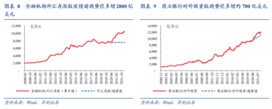首先,人民币汇率目前有约3000亿美元的待积压结汇“护体”,背后存在“底气”。金融机构外汇存款规模可衡量居民部门的外汇资金,未与银行进行结汇,而是直接以外汇的形式存在银行外汇存款账户上,这部分资金反映居民部门待结汇规模。金融机构外汇存款规模在疫情前保持在约7500亿美元的水平,疫情后快速提升至1万亿美元以上,即多增加的未结汇资金(积压待结汇)规模约2800亿美元。商业银行对外投资规模可衡量居民部门与商业银行结汇后的外汇资金,商业银行未将其与央行进行结汇,而是直接进行对外投资,这部分资金反映商业银行待结汇规模。商业银行对外投资规模在疫情前每月环比平均+0.7%左右,按趋势增速估算,目前实际待结汇规模较趋势值多增(积压待结汇)约700亿美元。二者合计来看,截至2022年3月积压待结汇体量约3000亿美元。