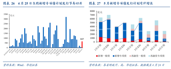 实际发行更新:4月末周新增专项债发行节奏回升。4月25日当周计划发行新增地方债680亿,其中一般债33亿,专项债647亿;4月累计发行新增地方债(含已公布未发行)1073亿,其中一般债170亿,专项债903亿。