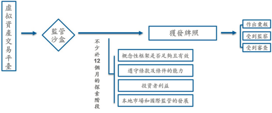 例:香港金融管理局监管沙盒[12] ![]() 由上图看见,在香港申请虚拟资产(即数字资产)交易平台相关牌照的门槛较为严格。虚拟资产交易平台必须提供虚拟资产交易、结算及交收服务,并对投资者资产拥有控制权。换言之,香港证监会只给中心化的虚拟资产交易平台发牌。若对于涉及虚拟资产投资的资管公司、基金分销商等,若有10%或以上的管理资金投资于不构成“证券”或“期货合约”的虚拟资产,则必须申领相关的牌照并受到香港证监会的监察。 在香港,虚拟资产相关企业进入监管沙盒的门槛较高,对过往经营历史有著较严格的规定。通过监管沙盒获取牌照发放的企业,需要经过至少12个月的审核期 |