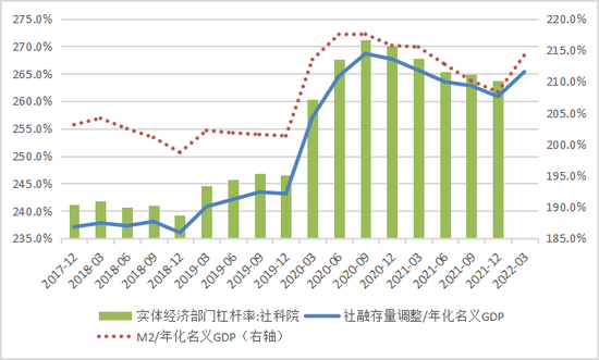 注:(1)社融存量调整=社融存量-贷款核销存量-非金融企业境内募股存量;(2)年化名义GDP为往前四个季度滚动合计。