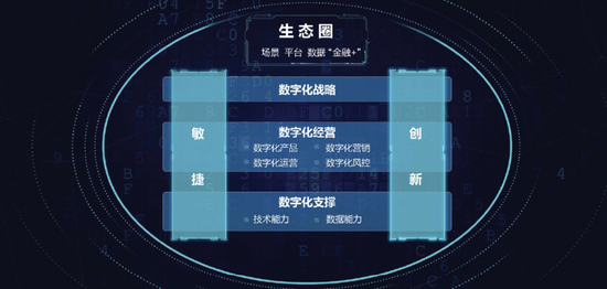第三个维度:建立活户生态。围绕用户交易行为搭建整个生态的基础服务设施,通过存、贷、汇、付等金融服务为生态合作伙伴和用户赋能,与生态内各类机构分享流量,开放数据接口,设立产品模块,共建‘金融+’生态圈。