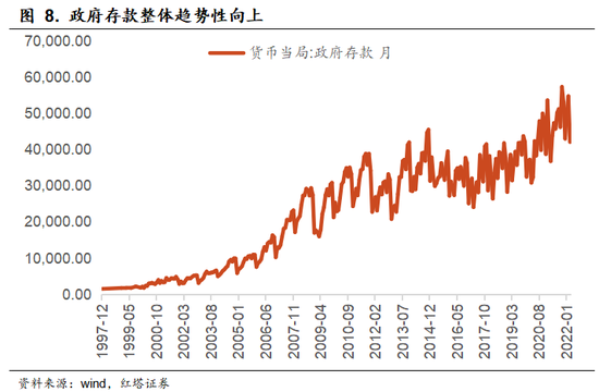 这里需要额外注意的是,如果拉长趋势来看,我们会发现政府在央行的存款整体是在不断增长的。政府存款持续增长的背后是随着政府收支规模增长带来的长期趋势性增长,毕竟每年政府也不会把钱都花完,那么有一部分资金就会结转留存下去,并体现为政府存款的持续上行。
