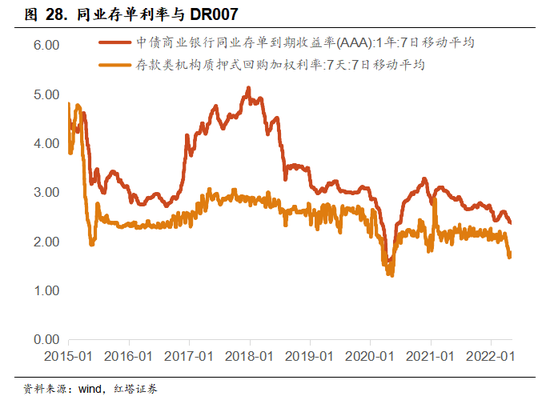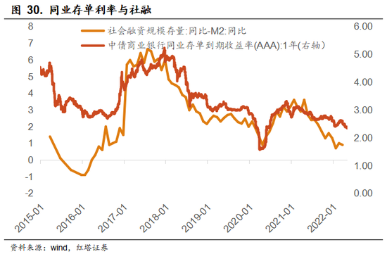 社融同比-M2同比收窄往往意味着实体融资比较弱,这一来会使得资金淤积在银行间市场,二来银行发行同业存单补充负债的需求也会降低,最终体现为同业存单利率下滑。
