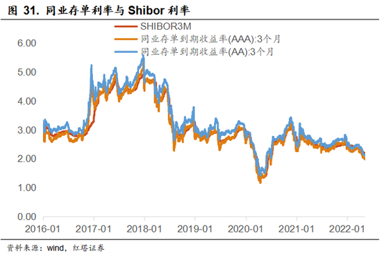 以同业存单为例,为了Shibor利率与市场利率的相关性。《同业存单管理暂行办法》表明同业存单利率需要参考Shibor利率为基础进行市场化定价。从数据上我们也能够看,同业存单利率与Shibor利率整体的走势是一致的,其中AAA级同业存单的利率与Shibor利率接近重合。目前 3 个月 SHIBOR与同期限同业存单发行利率的相关性在 90%左右。