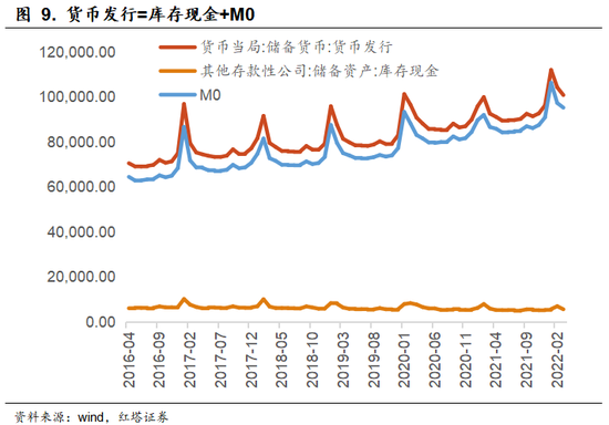 第三,货币发行。货币发行包括M0和商业银行的库存现金。其中,商业银行库存现金规模小、波动低,主要是商业银行为了应对日常的资金取款需求等准备的资金。