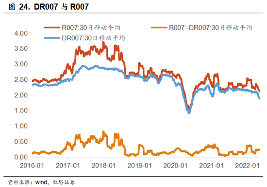 比如在2017年的时候,当时随着金融严监管时代的到来,货币政策和金融监管政策开始大幅收紧,市场资金利率明显上行,而此前金融同业业务的发展以及金融机构加杠杆、加久期行为的流动使得非银机构在监管收紧之后,存在较大的融资压力,所以这一时期R系列利率大幅上行,DR007与R007的差距明显走阔。