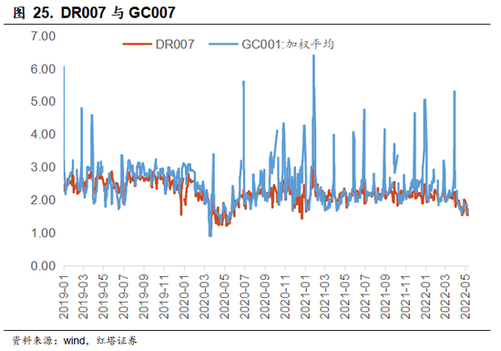 和银行间一样,在这9个品种中,交易规模最大的主要还是隔夜回购,GC001占比往往在80%以上,其次则是7天期利率,虽然占比规模不足,但是毕竟波动率会明显低于隔夜。在2018年到2022年4月末,GC001和GC007的方差分别为0.96和0.64,即GC007相比于隔夜更加的稳定。