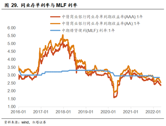 那么这两者之间的关系如何呢?从历史数据上看,在2019年之前两者的关系并不明确,但是在2019年之后,随着国内利率体系的逐渐完善,从政策利率向市场利率传导的渠道不断畅通,同业存单利率大致会在MLF利率附近波动。