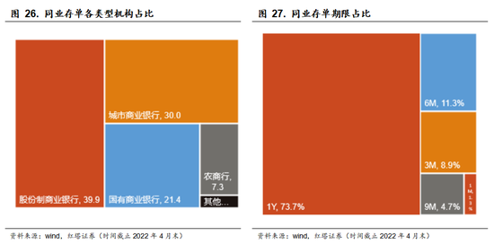 从发行机构上看,股份行和城商行是同业存单的发行主力,两者的占比分别达到了39.9%和30%。从发行年限上看,1年期同业存单是机构发行的主要品种,4月存量同业存单中,9个月至1年期的同业存单占比达到了74%。