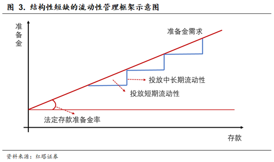 简单来说,结构性流动性短缺的货币政策操作框架是指在法定存款准备金制度下,随着存款规模的上升,银行需要缴纳的法定存款准备金规模也不断增加,而央行是基础货币的唯一供给方,因此央行可以将流动性维持在一个供给略小于需求的局面,从而制造出“流动性短缺”局面,以此来维持央行的优势地位。