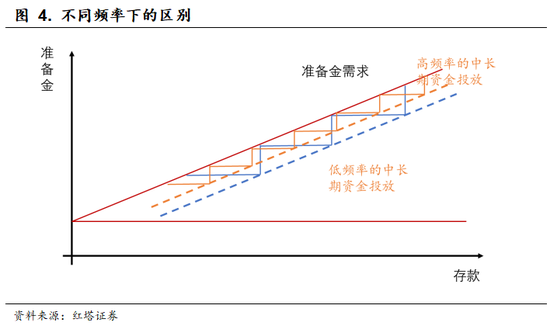 即央行中长期资金的投放频率越低,每次周期中,商业银行面临的资金缺口越小,资金波动越低。