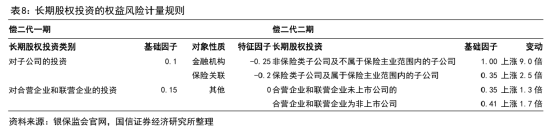(1)长期股权投资:新规则下对非保险业务的子公司采用1的比例足额计提资本,而旧规则下为0.1,远超国际惯例,这对于拥有众多子公司的大型寿险企业而言影响较大,未来子公司的处理值得关注。