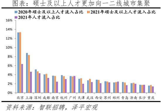 从来源看,2021年人才向上海流入的前十大城市合计占比38.8%,高于2020年的37.8%,上海人才来源集中度有所上升。其中,长三角城市有3个,合计占比10.5%,低于2020年的15%。人才流入上海主要因为上海的经济体量大、薪酬水平高,新经济促进政策初见成效且上海放宽人才引进政策。2021年上海GDP规模超4万亿、人均可支配收入8.2万元,均位列全国城市第一。根据上海市经济和信息化委员会数据,2021年上海的中国互联网百强企业数、企业互联网业务累计收入同比增速分别为20家和35%,居全国各省市第2位和第1位,“在线新经济”发展效果明显。2020年11月新版《留学回国人员申办上海常住户口实施细则》中取消留学生回国后首份工作地不在上海的限制并新增3个留学生激励政策;上海市2021年新版《上海市引进人才申办本市常住户口办法》将人才引进落户通道由16个增加到18个,落户通道明显放宽;在21年底放宽五大新城和自贸区的落户政策,本地应届研究生可直接落户。
