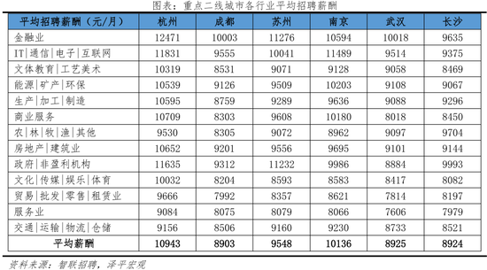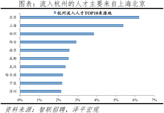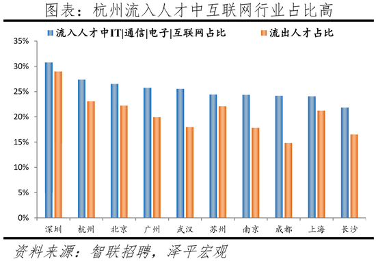 从来源看,2021年人才向杭州流入的前十大城市合计占比达32.5%,相比2020年人才前十来源地的36.2%下降。其中有3个来自长三角地区,合计占比达10.7%,相比2020年下降明显,其中北京代替上海成为杭州人才第一大来源地,杭州人才来源地区更加多元,引才范围更广泛。人才流入杭州主要是因为产业发展迅速,尤其以阿里巴巴为代表的电商行业发展较快,并且收入水平高。根据杭州市统计局,2021年杭州市数字经济核心产业增加值4905亿元,同比增长11.5%,两年平均增长12.4%,高于其GDP增长速度。作为“电商之都”,杭州2021年流入人才中IT|通信|电子|互联网行业占比27.3%,明显高于除深圳外的其他重点城市,其中10.3%流向互联网/电子商务二级行业,高于其余的重点城市。同时2021年杭州平均招聘薪酬10943元/月,在重点城市中位列第四,高于一线城市广州,较有吸引力。从去向看,杭州人才外流的前十大城市合计占比达43.0%。其中,有7个去向长三角地区,合计占比达30.5%,相比2020年提升4.1个百分点,杭州人才主要向长三角地区流动,区域内交流日益密切。