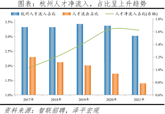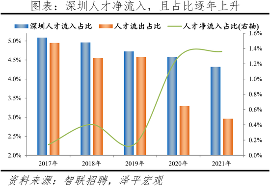3)深圳:2017-2021年人才净流入占比分别为0.1%、0.4%、0.2%、1.3%、1.4%,近两年人才集聚明显,主因深圳经济发展速度快、创新发展水平高,引才留才能力强,由于深圳人口承载力有限,近年深圳也开始控制人口有序增长;深圳和广州互为人才外流目标城市的第1位,人才从广州净流向深圳。从人才流入流出占比看,2017-2021年深圳人才流入占比从5.1%降至4.3%,人才流出占比从4.9%降至3.0%,人才跨区流动性下降。由于流入流出占比降幅相当,近两年人才净流入占比保持平稳,2020、2021年人才净流入占比分别为1.3%、1.4%。