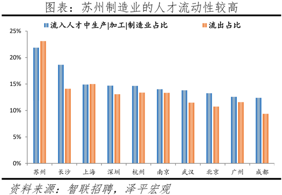 从来源看,人才向苏州流入的十大城市合计占比达到36.5%,其中5个城市为长三角地区城市,合计占比达到22.4%,苏州与长三角中城市的人才交流密切。人才流入主因苏州经济实力雄厚、创新发展领先,并且地处长三角腹地、距离上海最近,是资源外溢最大受益者,吸引人才集聚。2021年苏州GDP为2.27万亿,居全国第六、全省第一,位列长三角第二、仅低于上海。2021年GDP同比增长12.6%,为重点城市最高。根据人工智能和大数据科技企业合合信息旗下启信宝发布《科技企业地图》,2017-2021年苏州市对科技企业吸引力最大,净流入600余家科技企业。从去向看,苏州人才外流的前十大城市合计占比达到50.3%,其中6个城市为长三角区域城市,合计占比为39.2%。苏州制造业全国领先,2021年,规上工业总产值全国第二、增加值全国第三,苏州制造业人才流动性明显高于其他城市,2021年苏州流出人才的23.1%来源于生产|加工|制造业,流入人才的21.9%来源于生产|加工|制造业。