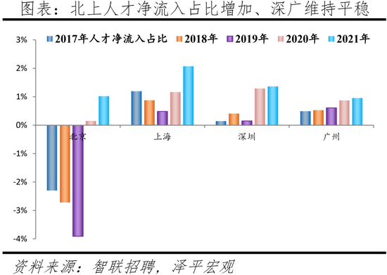 从人才净流入占比看,2021年北上深广人才净流入占比分别为1.0%、2.1%、1.4%、0.95%,上海最高、广州最低。从人才净流入占比变动趋势看,北京因严控人口、疏解产业,人才净流入占比逐年下降,直至2020年有所回升,2021年继续创新高,主因2021年人才引进政策放宽;上海人才净流入占比变动呈“V”型,2021年人才净流入占比为2.1%,重回榜首且创近五年新高,主因上海新经济促进政策初见成效且落户政策放宽;深圳、广州2021年人才净流入较去年基本维持不变。