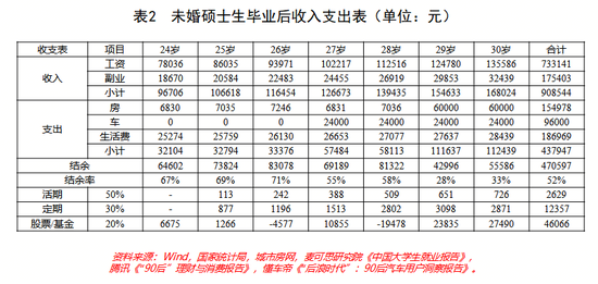 我们假定这群人于2014年踏入社会,根据调查当年硕士生的毕业薪酬为6503元/月,副业按照硕本工资比1.6同比例提升,并在毕业第四年、第六年分别购买车和房。类似地,也可以得到未婚硕士生毕业后的收入支出表。