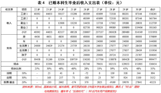 首先来看已婚本科生的收支情况。由于婚姻使得房车购买时间大大提前,所以已婚本科生的各项支出都较早。