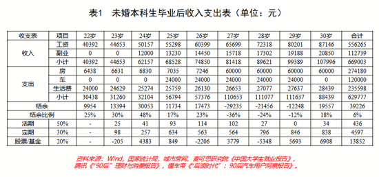 1990年出生的本科生在2012年毕业踏入社会,跟据《中国大学生就业报告》《90后理财与消费报告》等的数据显示,当年大学生人均薪酬为3366元/月,在毕业两年后培养自身的副业,但由于限于学历,副业收入假定为1000元/月,结合前文的思路,可得到未婚本科生毕业后的收入支出表。