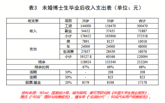 博士由于自身财富积累年限短,在毕业前买房并不现实,所以在毕业时通过租房过渡,并未背上房贷,从而可以得到未婚博士生毕业后的收入支出表。