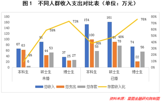 (1)已婚人群存款收入普遍要比未婚人群高,虽然他们支出更多,但收入也在成倍增加。