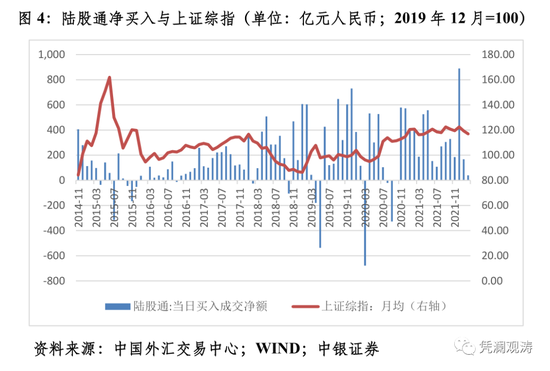 美联储紧缩引发风险资产调整的传染效应。对1990年12月至2022年2月间的月均上证综指、标普500指数和10年期美债收益率取自然对数进行相关性分析显示,10年期美债收益率与标普500指数表现为负相关0.804,标普500指数与上证综指为正相关0.815,均为较强的相关性。这表明,从较长时期来看,全球无风险资产定价之锚——10年期美债收益率越高,美股表现越差,而美股表现差,也会带动A股下行。2021年以来,美联储和IMF已多次预警,货币宽松不及预期,有可能引发全球风险资产价格调整。继2021年3月份美债收益率飙升、美股巨震之后,2022年1月份,受类似因素影响,美股再度剧烈震荡,A股也跟随调整,同期陆股通累计净买入成交额环比下降81%,同比减少58%;2月份,叠加俄乌冲突升级,陆股通累计净买入成交额环比下降76%,同比下降90%(见图4)。鉴于此次美联储退出,既要稳物价,又要稳经济,还要稳金融,政策力度难以拿捏,存在较大的市场沟通难题,故紧缩过程中金融动荡恐难避免。