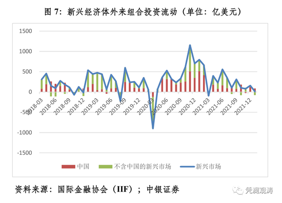 发达经济体货币政策集体转向加大新兴市场资本外流压力。如前所述,若其他发达经济体经济也加快货币紧缩步伐,将抑制美指涨势,却会推高发达经济体债券收益率,加速国际资本回流成熟市场。最近,全球负收益债券规模大幅回落。到2022年1月底,全球负利率债券降至4.54万亿美元,远低于2020和2021年末分别为18.38万亿、11.31万亿美元的规模。叠加货币紧缩引发的全球风险资产价格震荡,2021年8月~12月,新兴市场外来组合投资净流入月均155亿美元,较2020年4月~2021年7月均值减少67%。同期,不含中国的新兴市场外来组合投资净流入减少76%,2022年1月更是变为净流出77亿美元,为过去六个月来第三次净流出;中国迄今仍扮演着“避风港”角色,但月均净流入减少58%,2022年1月份净流入环比下降28%,同比下降83%(见图7)。