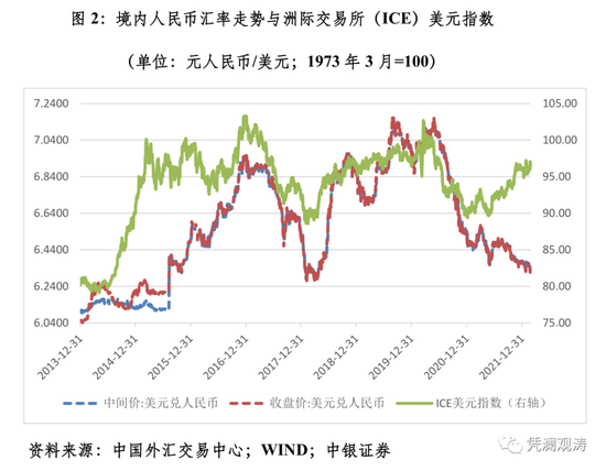 发达经济体货币政策集体转向加大美元走势的不确定性。上次,自2013年中释放量宽退出信号到2017年之前,美联储货币紧缩一直领先其他主要央行,这支持了美指走强。直到2017年,主要经济体经济走势和货币政策分化收敛,美元指数才出现较大回调。同年,中国借机在中间价报价机制中引入“逆周期因子”,实现汇改人民币不跌反涨的成功逆袭。这次,迫于全面通胀的压力,除日本央行处于观望之中外,现在以美联储、英格兰银行为代表的主要央行大都改口“通胀暂时论”,已经或准备启动加息和缩表进程。即便是犹豫之中的欧洲央行,2022年首次议息会议后也承认通胀的严重性超乎预期,并罕见地没有表态“今年不太可能加息”。这导致2022年前两个月,在美联储加快货币紧缩、俄乌冲突升级的背景下,ICE美元指数累计仅上涨0.8%(两个月美指均值较2021年12月份还跌了0.2%)。同期,人民币汇率随美指涨跌震荡盘整,兑美元汇率中间价累计升值0.8%,CFETS人民币汇率指数上涨1.9%(见图2和图3)。