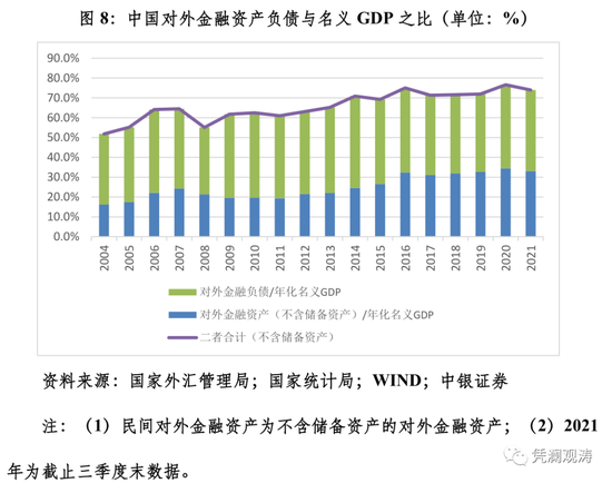 中国对外风险暴露随着金融开放扩大而增加。1998年亚洲金融危机和2008年全球金融海啸中,中国受到的金融冲击较小,主要是因为当时对外开放程度较低。但近年来,中国加快扩大金融双向开放。到2021年9月底,民间对外金融资产负债与名义GDP之比较2008年底上升了18.9个百分点,其中,对外资产和负债占比分别上升11.7和7.2个百分点(见图8)。与上次危机相比,这次主要央行货币放水是“快进快出”,全球流动性拐点或将来得更早、更猛。虽然从短债/外汇储备之比看,国家整体偿债风险较低,但中国短债平均占比50%多(国际警戒线为低于25%),个别企业短债占比可能更高,面临更大的外汇流动性风险。同时,不少企业以境外机构名义海外筹资,不在中国外债统计口径内。若全球流动性收紧,美元利率汇率上扬、人民币汇率走弱,将推升相关企业海外再筹资的风险溢价,或加大对境内实体代偿债务的依赖。另一方面,到2021年9月底,民间对外金融资产5.68万亿美元,其中既有直接投资也有间接投资,既有成熟市场也有新兴市场资产。若全球金融动荡包括脆弱新兴市场发生“缩减恐慌”,将危及中国在当地的资产(包括债权)安全。