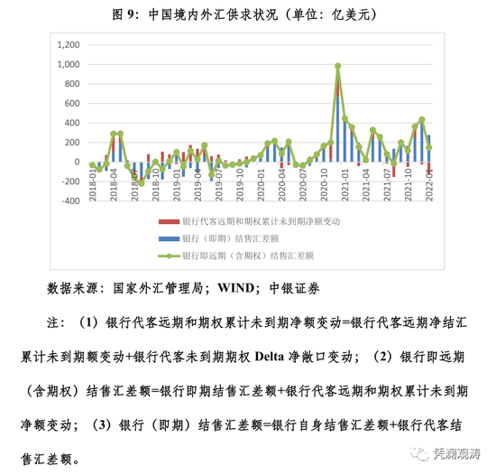 情景一:人民币汇率继续走强但涨幅放缓。这是美联储货币紧缩启动之初或货币紧缩力度不足的情形,也就是当下的情形。2022年1月份,受美债收益率飙升影响,境外净增持境内人民币债券减少、陆股通项下北上资金净流入下降,债券通和陆股通北上资金合计净流入环比下降48%,同比下降68%;银行即远期(含期权)结售汇顺差149亿美元,环比和同比均下降66%(见图9)。当月,3个月环比的人民币汇率中间价月均值仅上涨0.95%,较上月涨幅回落了0.46个百分点(2月份环比涨幅进一步回落0.19个百分点);人民币实际有效汇率指数较上月回落0.7%(见图3)。可见,无论从数量还是价格看,当前人民币升值动能均有所减弱。若未来因市场供求(如外资流入减少、贸易顺差下降)或国际金融市场变化(美元升值),将进一步减轻人民币升值压力。