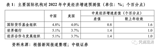 经济走势分化导致中美货币政策分化。2012年以来,中国经济下行,增速分别于2012年、2016年跌破8%、7%。2015年,中美经济增速差异为4.3个百分点,远低于2011年的8.1个百分点。在此背景下,美联储自2014年初起,采取缩减购债、加息、缩表等措施逐步实施货币政策正常化,而中国央行采取降准、降息、扩表等措施逐渐转向稳增长。这次,自2021年下半年起,中国重提做好跨周期调节,保持经济运行在合理区间。美联储迫于通胀压力加快货币紧缩步伐,而中国央行则连续降息降准。据主要国际机构最新预测,经历了2021年的恢复后,2022年中美经济复苏势头同时减弱,但美国经济增速仍在趋势值以上,而中国在潜在增速的下限附近,中美经济增速差异将是1990年代以来最低(见表1)。预计2022年,中美货币政策分化将进一步扩大。