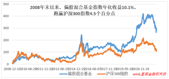 从历史业绩表现看,权益型公募基金的表现还是不错的。当前的市场无疑处于历史底部位置,2008年末以来(截至2022.5.17),偏股混合型基金指数年化涨幅为10.1%,跑赢沪深300指数4.5个百分点,更是大幅跑赢存款和通胀。起点和终点均为市场底部,这个业绩能较为真实地反映偏股型公募基金的投资业绩。