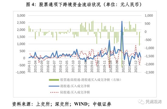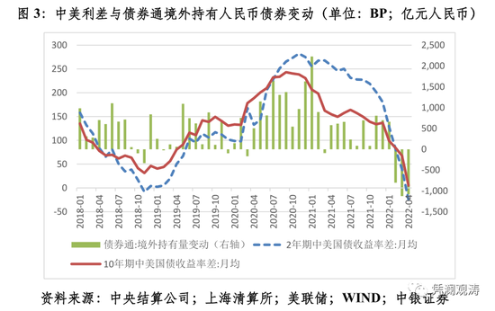 4月份,债券通项下,外资净减持人民币债券1085亿元,是连续第三个月净减持,减持规模环比下降了40亿元。这既反映了中美利差收敛甚至倒挂的影响,也反映了全球债券市场调整引发的资产再平衡效应,还反映了俄乌冲突引起的地缘政治风险外溢(见图3)。