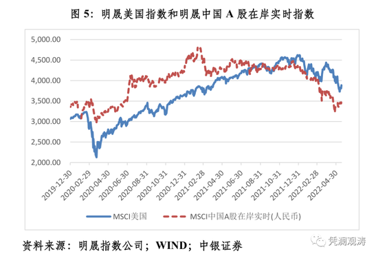 股票是典型的风险资产。外资对人民币股票和债券资产的处置不尽相同,更加印证了资产再平衡效应的猜想。从明晟指数(MSCI)看,前4个月,美国指数下跌了14.2%,中国A股在岸指数下跌了20.9%(见图5)。显然,人民币股票不存在因资产再平衡产生的外资减持压力。陆股通项下,除3月份外资净减持451亿元外,2月和4月份分别净增持40亿和63亿元,对此形成了数据支持(见图4)。4月份,陆股通项下跨境资金流动状况环比大幅改善,进一步反映当月债券通项下外资持续净减持是受资产再平衡效应的影响。人民币急跌减记了人民币债券资产的美元价值,加速了境外投资者资产再平衡的调整。