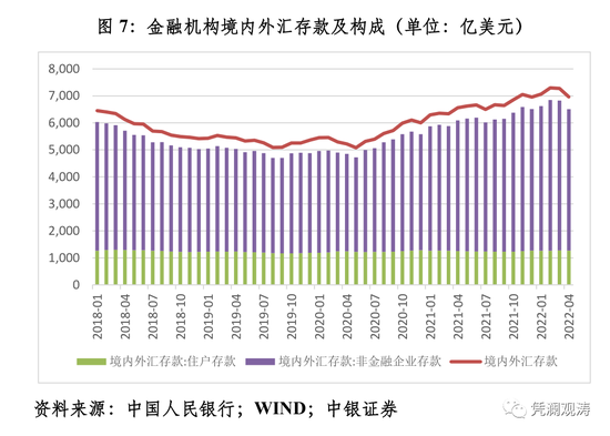 在这波人民币汇率调整行情中,还触及了第二重保护,即企业外汇存款和银行外汇头寸增加,发挥了民间外汇储备调剂外汇收支平衡的二级“蓄水池”作用。3~4月份,非金融企业境内外汇存款合计减少344亿美元,显示企业在3月中旬以来的这波人民币急跌行情中,更多用自有外汇对外支付或结汇(见图7);2月份,银行即远期(含期权)结售汇年初65亿美元,但央行外汇占款增加62亿元。
