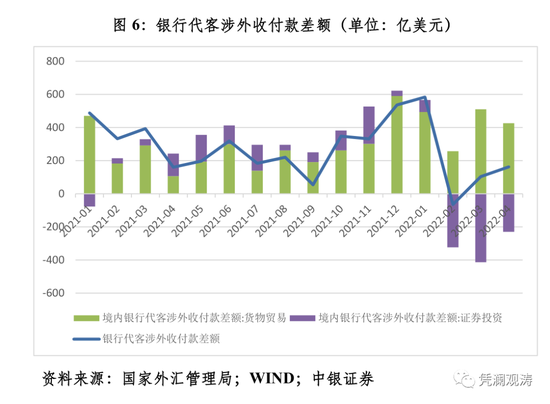 总体上,4月份外资净减持人民币资产状况较上月有所改善。这反映为银行代客证券投资项下涉外收付逆差230亿美元,为连续第三个月净流出,但规模环比减少45%。同期,银行代客货物贸易项下涉外收付顺差426亿美元,抵消了证券投资项下的净流出;银行代客涉外收付总顺差162亿美元,为连续第二个月净流入(见图6)。