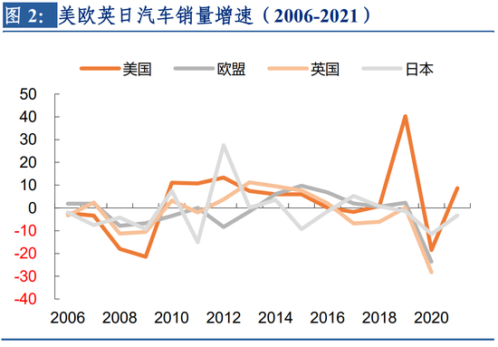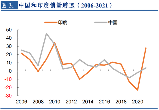 2018之前,全球汽车销量和经济增速息息相关,表明汽车消费对于经济增长的带动作用。2021年,美中欧日英印这六大经济体的GDP占全球的70%。2006至2017年,美国、欧盟、英国和日本的汽车销量年平均增速分别为0.65%、0.04%、0.49%和-0.41%,欧美英日汽车消费的低速增长与经济的低速增长相一致。而同一时期,中国和印度的汽车销量年平均增速分别为15.07%和9.55%。中国和印度汽车消费的快速增长与这一时期经济的快速崛起相一致。