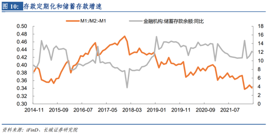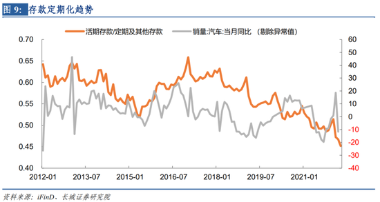 从微观角度,中低收入居民消费倾向下滑可能是汽车销量大幅下滑的主要原因之一。2018年,居民消费倾向开始下滑,主要表现在居民活期存款占比不断下降,存款定期化趋势显著。M1/(M2-M1)也能反映出居民和企业均在提高储蓄倾向,金融机构储蓄存款增速近几年维持较高增速。