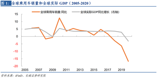 过去十几年,汽车销量增速和全球经济增速息息相关,直到2018年后才出现背离。2005年至2017年,全球乘用车销量平均增速为3.8%,全球实际GDP同比平均增速为3.7%,且两者的走势基本一致,由此可以看出汽车销量和经济增速密切相关。但从2018年开始,全球汽车销量和经济增长出现了较大背离。2019年,全球乘用车销量同比减少6.3%,而全球经济增长2.8%。无论是相关还是背离,以汽车销量来洞察经济是一种见微知著的分析方法。