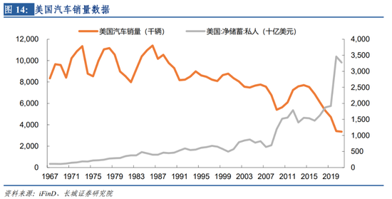 过去七年,美国汽车销量持续下滑,原因除了供应链断裂问题之外,居民储蓄率上升也是下滑的主要原因。2008年以后美国储蓄率大幅提升,到2012年后暂且停歇,但到了2016年之后又快速上升,并且到了2020年因疫情的影响储蓄率几乎垂直上升。储蓄率的上升表明了居民消费倾向的下降,而这进一步影响到汽车消费,2016年汽车销量接近700万辆,到2019年只有500万辆左右,大幅下降,到了2020年只有250万辆左右。