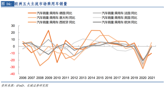 长期来看,欧洲经济增长缺乏动能,无法支撑汽车消费,汽车销量难以回到疫情前。2022年2月8日,欧盟公布《芯片法案》,拟动用超过430亿欧元(约合人民币3114亿元)资金支持芯片制造。到2030年,欧盟计划将芯片产量占全球的份额从目前的10%提高至20%。但我们认为,欧洲经济在疫情后损失巨大,如今遭到俄乌战争影响,经济复苏受阻。随着中美在高科技领域的投入,欧盟的产业或将逐渐落后。欧盟汽车市场难以回到疫情前。