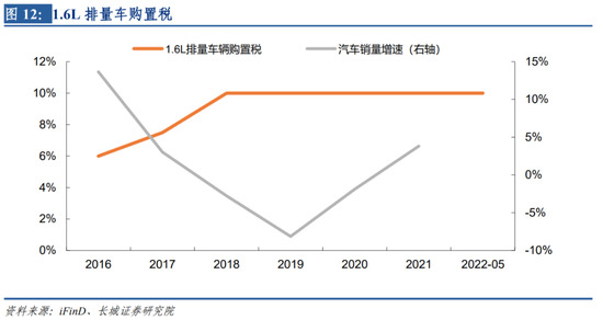 2015-2017年,中国大幅下调车辆购置税,2018年取消车辆购置税优惠政策导致汽车销量下滑。2015年10月-2016年12月,国务院按照排量等级下调汽车购置税。比如1.5L-2L排量的汽车购置税从10%下调至6%。2017年,对购置1.6L以下排量的乘用车按7.5%的税率征收车辆购置税。2018年,车辆购置税恢复至10%。可以看出,在车辆购置税恢复至10%后,汽车销量增速连续三年负增长,直到2021年才触底反弹。