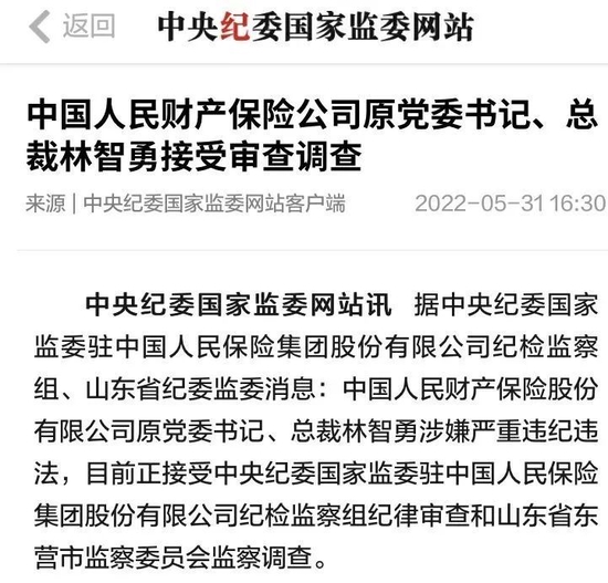 2022年5月31日,人保集团原业务总监,人保财险原党委书记、总裁林智勇落马。