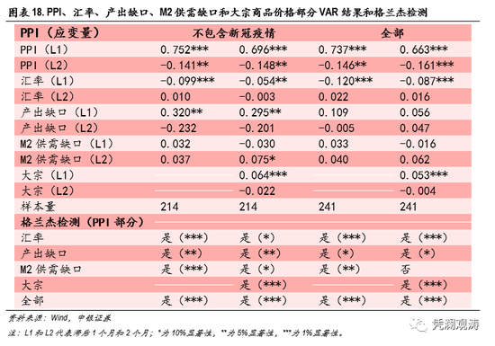 再看PPI结果(见图表18)。PPI较CPI存在更强的自相关性。不同的是,不管是否包含新冠疫情期间的样本,滞后一个月的汇率变动均会显著影响PPI增速,具体表现为1%的升值会带动PPI增速下降0.05至0.12个百分点,说明汇率对PPI的传导效应显著强于CPI。这与第一部分的数据特征相符。此外,国际大宗商品价格的输入型通胀对PPI影响也更大更显著。值得注意的是,在包含新冠疫情样本后,产出缺口对PPI的影响变得不再显著,且效果更小。2008年四万亿元基建和2016年棚改都是我国政策发力带动PPI上行,为全球经济走出低迷做出较大贡献。这次,虽然我国仍出力不少,为疫情期间的全球供需平衡做出巨大努力,但是全球的供给端通胀冲击和中美经济错位使得近两年数据屡屡“打架”,第二大经济体的产出负缺口(需求不足)并未缓解全球通胀压力。比较有趣的是,虽然M2供需缺口对PPI影响并不显著,但是通过了格兰杰检测,即M2供需缺口是PPI的格兰杰因素。此外,格兰杰检测显示,汇率、产出缺口和大宗商品价格均是我国PPI的格兰杰原因。汇率部分结论与CPI相同。