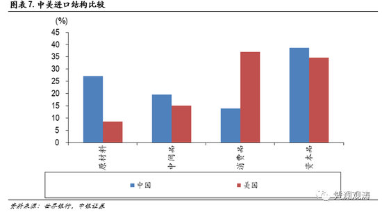 中国消费品进口依赖小,汇率的直接影响较为有限。根据世界银行WITS数据显示,2019年我国进口中原材料、中间品、消费品和资本品占比分别为27.1%、19.7%、14.0%和38.7%;其中消费品占比显著低于美国的37%(见图表7)。按照2019年美元兑人民币平均汇率6.9换算,我国进口消费品占国内社零总额仅在5.5%左右,远低于美国消费品进口占美国零售总额的15.4%,说明我国消费基本上是“自产自销”模式,汇率的直接影响较小;而美国则作为全球通胀发动机,内部需求和通胀压力带动外部的能力更强。