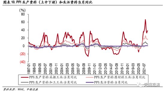 典型的如农林牧渔,从进口到形成消费品的产业链较短,汇率的影响应该较大。实际上,食用油脂进口价格和CRB油脂价格指数不仅波动较大,而且疫情以来涨幅也较大,2022年3月同比增长仍在40%以上;反而国内CPI食用油同比增速稳定,自2021年6月见顶以后持续下滑,2022年4月已经下滑至3.5%(见图表8)。在“中国人的饭碗任何时候都要牢牢端在自己手上”的号召下,我国基本上能做到粮食自给自足,粮油食品价格极其稳定。