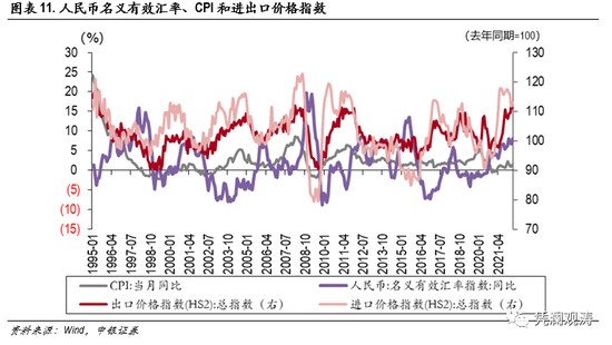再如传导链条较长的工业制成品,随着距离原材料越远,传导效率越低,表现为PPI上中下游的波动性逐层下降(见图表10)。虽然成本推动确实存在,但是由于我国企业数量分布呈现上游少、下游多,竞争程度逐层上升,市场占有率和客户关系往往是下游企业的核心考虑因素之一,导致价格从PPI向CPI传导较弱。另一方面,对于一个国家来说,如果汇率变动以相近的比例带动进出口价格变动,那么汇率对贸易行业的影响就是相对中性的,更多影响体现在可贸易企业之间的利润分配上。不过,由于国际和国内市场存在替代作用,在供给稳定的情况下,贬值带动出口量上升,从而减少国内供给和提升国内通胀压力。从过去三轮有效汇率贬值或者升值放缓(2001-2003,2009,2015-2016)的表现来看,在三次汇率下行中后期,进出口价格增速均有明显上升趋势,同时伴随着贸易条件逐渐恶化;而前两次CPI也同样有上升趋势(见图表11)。因而,我们仍需实证检验大宗商品价格的输入型通胀会否显著影响国内的CPI。