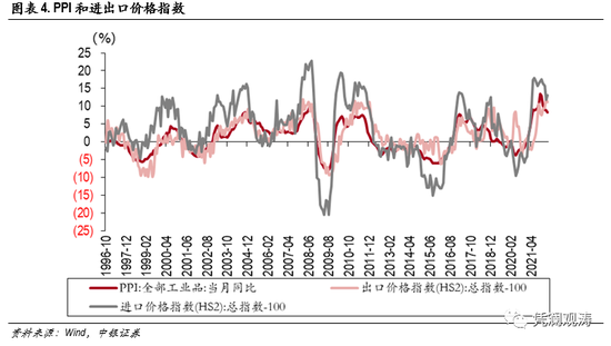 CPI方面,名义有效汇率同比与CPI同比的负相关性也在减弱。不同的是,2012年是CPI的转折点,明显早于PPI,2012年前为-0.3,2012年后为-0.1,主要可能受国内粮食价格波动骤降、我国特有的猪周期和近几年内需不足等因素影响(见图表3)。另一方面,CPI与汇率的相关性低于PPI与汇率的相关性,表明汇率对CPI的影响可能要小于PPI。由于进出口价格指数与PPI同比增速在走势上高度一致,汇率与PPI的规律同样体现在进出口价格指数上(见图表4)。这与我国PPI和进出口价格受全球经济影响较大以及CPI以内为主的直观感受相符。