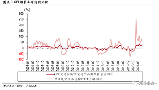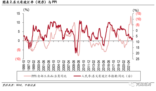 再以同样传导较短的石油为例,尽管国内对油价也有干预措施,但是石油进口依赖较高,石油到燃油的工序较短,汇率变动的传导效应较为突出,2022年4月布伦特油价同比仍高达61.2%,国内CPI燃料价格也处于震荡上行趋势,同比增速也达到28.4%(见图表9)。财务上看,人民币对美元升值或贬值,有助于降低或提高国内原油进口商的成本,存在向消费者转移的动机。数据上看,大宗商品确实存在输入型通胀的特征,汇率可能会在其中扮演“加速器”的作用。不过,曹剑涛(2019)实证分析发现,国内原油期货价格变动与离岸人民币汇率之间传导效应并不显著,反而是国内利率较好反映出国内外原油价格、离岸人民币汇率的传导作用。我们将在下文的“汇率-货币-价格”的货币视角着重分析。
